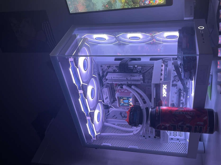 An indoor scene within the city of Bratislava, Slovakia, depicts a desktop computer setup in a dimly lit room. The primary subject is a large, modern white or light gray desktop computer tower with a transparent tempered glass side panel, centrally positioned. Its interior is brightly illuminated by purplish-white LED lights emanating from internal components. Visible internal hardware includes a motherboard (with partial "MSI" branding), white RAM modules, a liquid cooling system with white tubing and a small digital display showing "23:50", and a graphics card branded "Radeon" and "XFX". Three illuminated circular fans are mounted at the top of the case, and three similar fans are vertically arranged along the front panel. In front of the computer tower, a red and black "HELL CLASSIC" energy drink can, marked "500ml", stands upright on a desk surface. To the right of the computer, a portion of a vertical monitor screen is visible, displaying what appears to be a video game interface featuring organic, naturalistic graphics and text including "VICIN" and "AKHO". Above the computer on the wall, a framed dark-toned artwork depicts a stylized cartoon character, resembling an ape wearing sunglasses and a striped shirt. The immediate foreground reveals the edge of a desk and a section of a keyboard with red/orange backlighting. No individuals are present in the scene. The room's ambient light is low, with illumination primarily from the computer's internal LEDs and the monitor screen. A light-colored shelf is visible in the upper left background.
