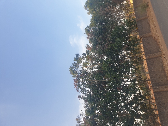 The scene depicts an outdoor environment in Bukuru, Nigeria, under a clear blue sky with minimal cloud cover. A dense line of tall, leafy trees, exhibiting a mix of green and reddish-brown foliage, dominates the middle ground. Their light-colored trunks are visible amidst the leaves. Directly in front of the tree line, a low, dark gray or brown concrete block wall extends horizontally across the frame. In the immediate foreground, a dark paved road is visible, with a strip of dry, light brown ground and sparse vegetation to its right. No individuals or active subjects are present.