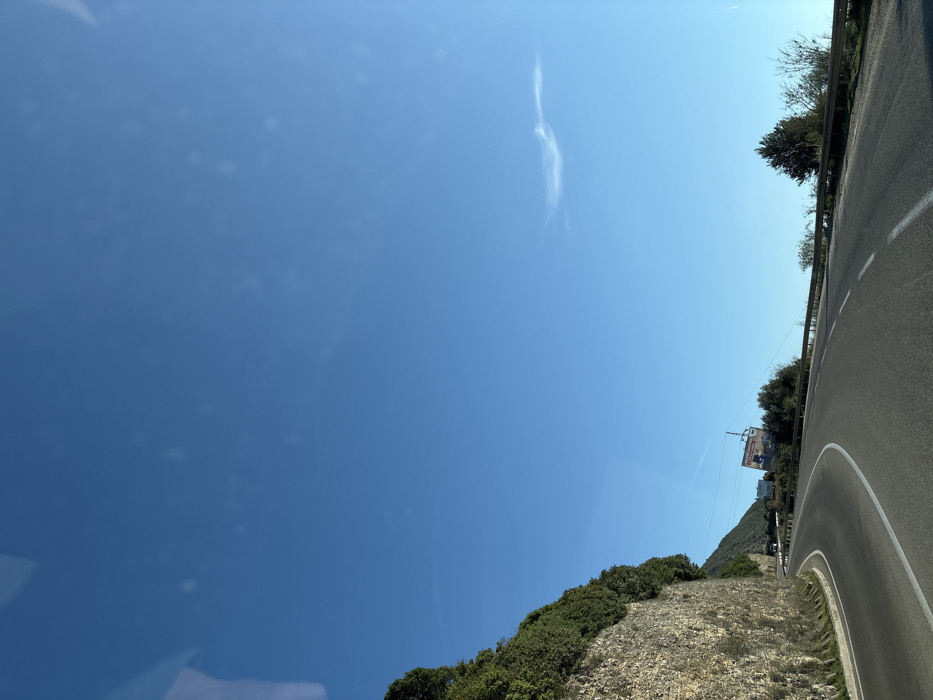 The image captures a roadside scene in Prijevor, Montenegro, presenting a clear, sunny day. The dominant feature is a two-lane asphalt road, marked with white solid and dashed lines, curving sharply to the right in the foreground before continuing into the distance. To the immediate left of the road, a steep, rocky cliff face densely covered with green vegetation rises. On the right side of the road, a metal guardrail runs parallel to the asphalt, beyond which lies a lower elevation featuring sparse trees and shrubbery. Further along the road's curve, a large rectangular billboard with a red border is visible on the right, displaying indistinct advertising content. A vehicle, possibly a truck, is discernible in the distance on the road near the billboard. The upper two-thirds of the image consist of a clear, bright blue sky with a singular, wispy white cloud formation in the upper right quadrant. Reflections, likely from a vehicle's interior, are present in the upper left portion of the frame. No individuals are visible.