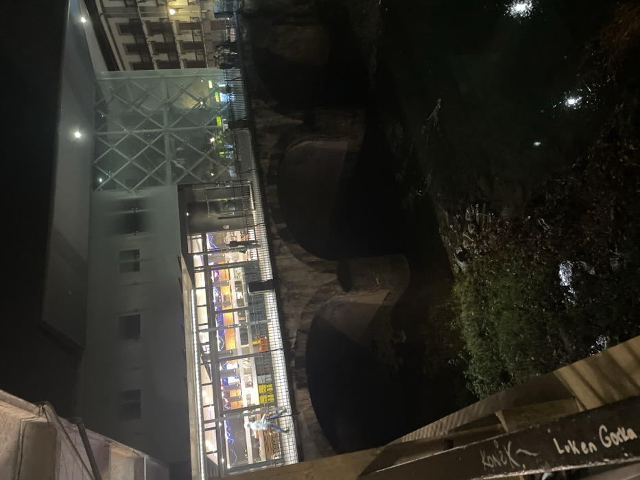 A night shot depicts a multi-arched stone bridge. A modern building with a glass facade stands adjacent to the bridge, brightly lit with interior lights. The river below reflects some light. Graffiti is visible on a wooden structure in the foreground. Vegetation grows near the riverbank.