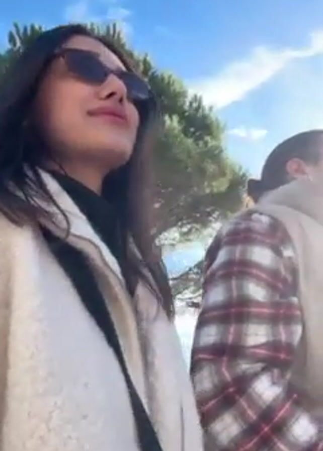 woman wearing a white teddy-bear coat and dark sunglasses walking next to a man. The woman is in focus and occasionally turns toward the camera and smiles. The man is wearing a tan vest and a red-and-black plaid shirt. He wears sunglasses and has his long hair tied back in a bun. He is on the phone. They are walking outside on a bright day. There is a blue sky with fluffy white clouds in the background. There are trees and palm trees in the background.