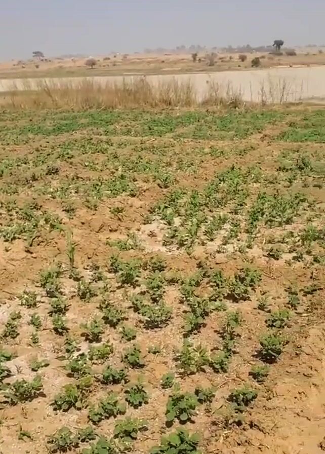 field of crops in a dry, rural landscape. The plants are small and green, sparsely scattered across the brown soil. In the background is a body of water, possibly a lake or reservoir, with dry vegetation lining its banks. The sky is pale and hazy, suggesting a hot and arid climate. The camera appears to be handheld and moves slightly, offering a view across the field towards the water in the distance.