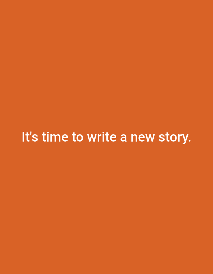 The image displays white sans-serif text centered horizontally and vertically on a solid orange background. The text reads: "It's time to write a new story." No people, discernible subjects (other than text), specific objects (other than the textual phrase), actions, or interactions are depicted. The environment is a uniform, untextured orange field. The image contains no visual information identifying a location in the city of Khiva, Uzbekistan, or any other physical setting.