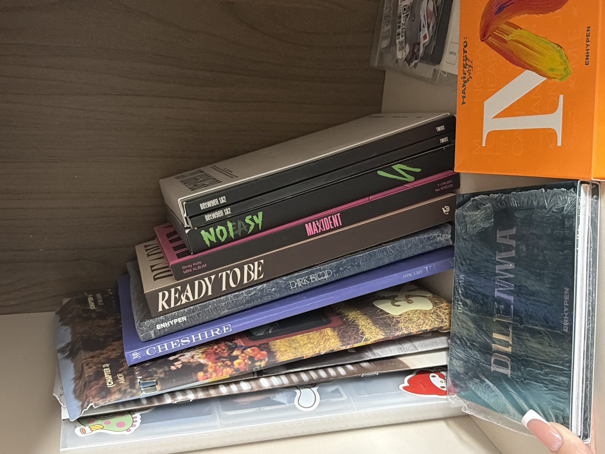 shelf with a stack of K-pop albums