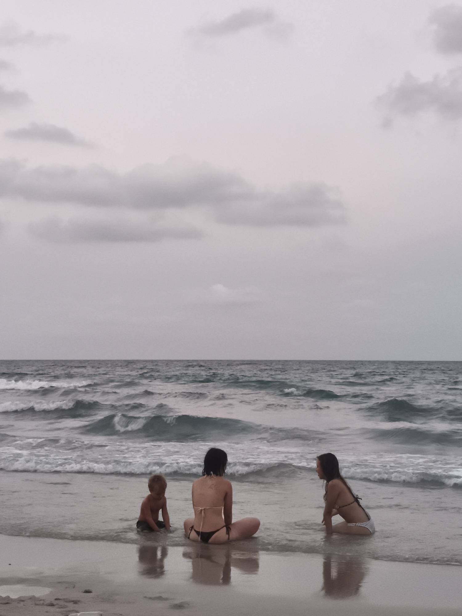 Three people are seated on a sandy beach at Baan Chaweng, Thailand. To the left, a young child sits cross-legged, facing the water. In the center, an adult woman sits with her back to the viewer. To the right, another adult woman sits sideways, facing the center. All three are at the water's edge where the waves are breaking. The sky is overcast, and the sea is a grey-blue.