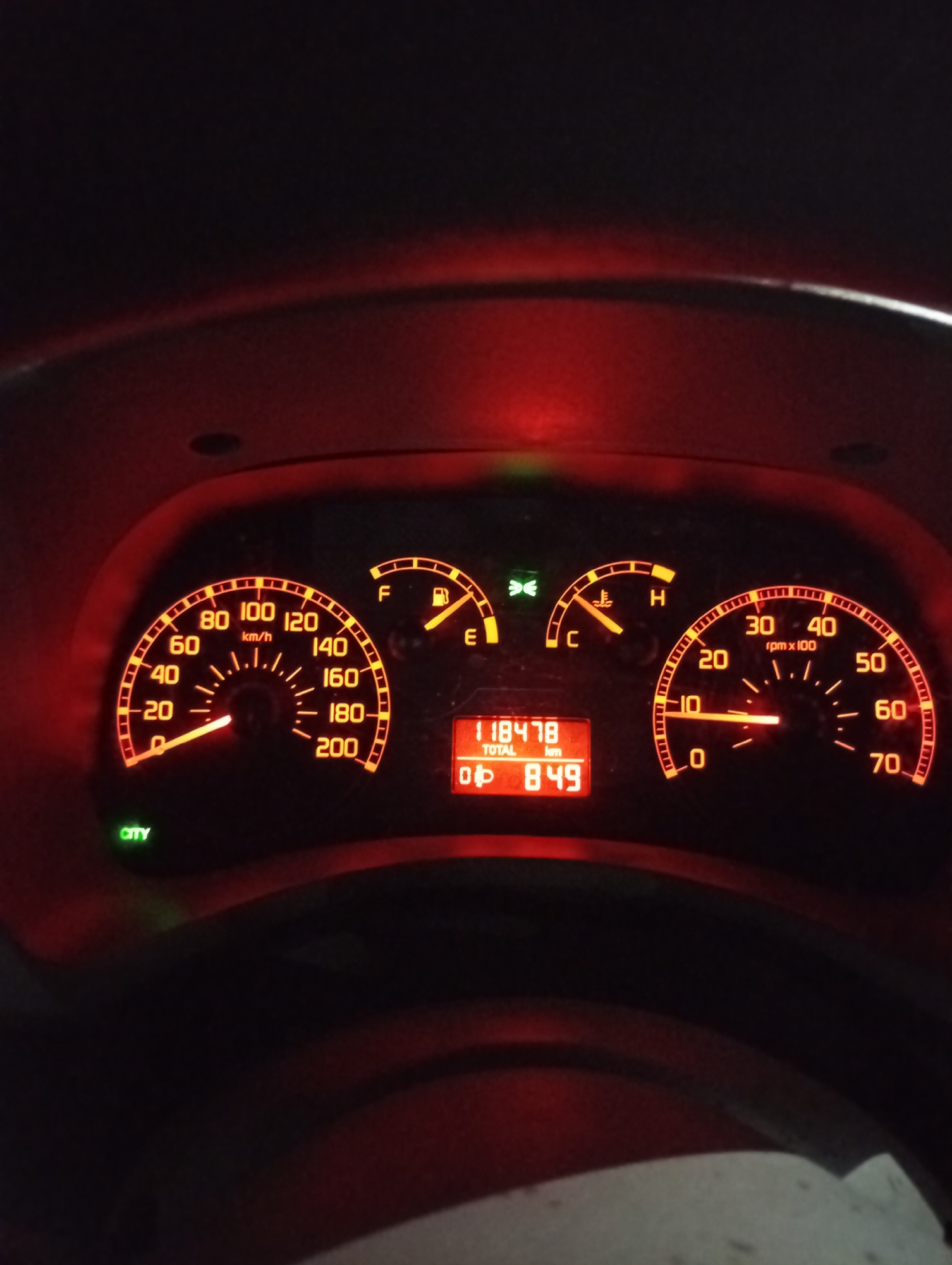 The scene displays the illuminated dashboard of a vehicle in Samokov, Bulgaria, observed in a low-light environment. The speedometer on the left indicates 0 km/h. The fuel gauge shows the tank is approximately three-quarters full. The engine temperature gauge points to the 'C' (cold) mark. The tachometer on the right registers the engine operating at approximately 1000 RPM. A central digital display shows a total odometer reading of 118,478 km and a trip meter reading of 84.9 km. A green "CITY" indicator light is illuminated on the lower left portion of the dashboard. A green low-beam headlight indicator is also active, positioned above the fuel gauge. The entire dashboard assembly is illuminated with a reddish-orange glow. No people are visible.