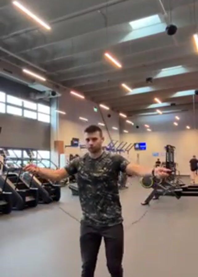A man is shown jump roping in a gym