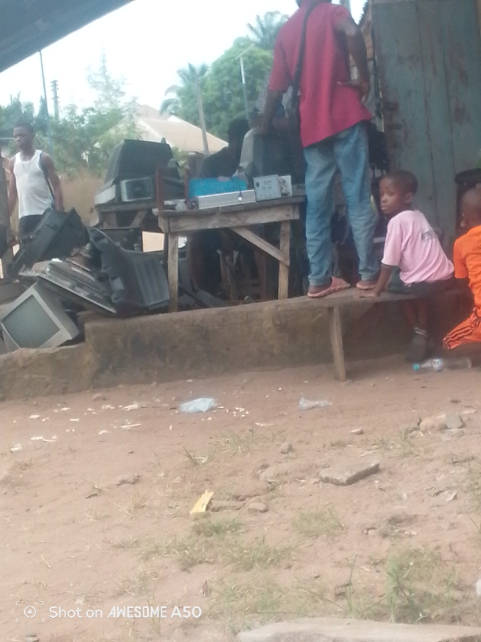 A roadside scene shows discarded television sets piled on a concrete ledge and wooden table. Several people are gathered, including a man in a red shirt standing on the ledge and a child in a pink shirt sitting on a wooden bench. Another child in an orange shirt is partially visible on the right. The ground is dirt with scattered trash. Trees are visible in the background.
