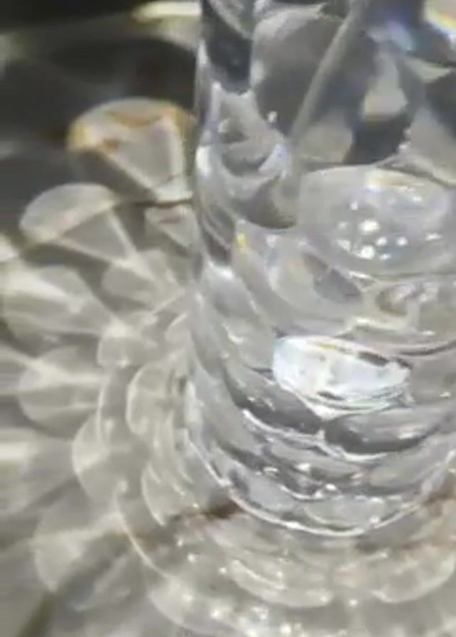 clear glass vase sitting on a surface. The vase has a textured, almost honeycomb-like pattern on its exterior. Light shines through the vase, casting a pattern of concentric circles on the surface beneath it. The surface appears to be made of marble or a similar material. The top of the vase is open and dark inside. The camera moves slightly, changing the angle of the shot.