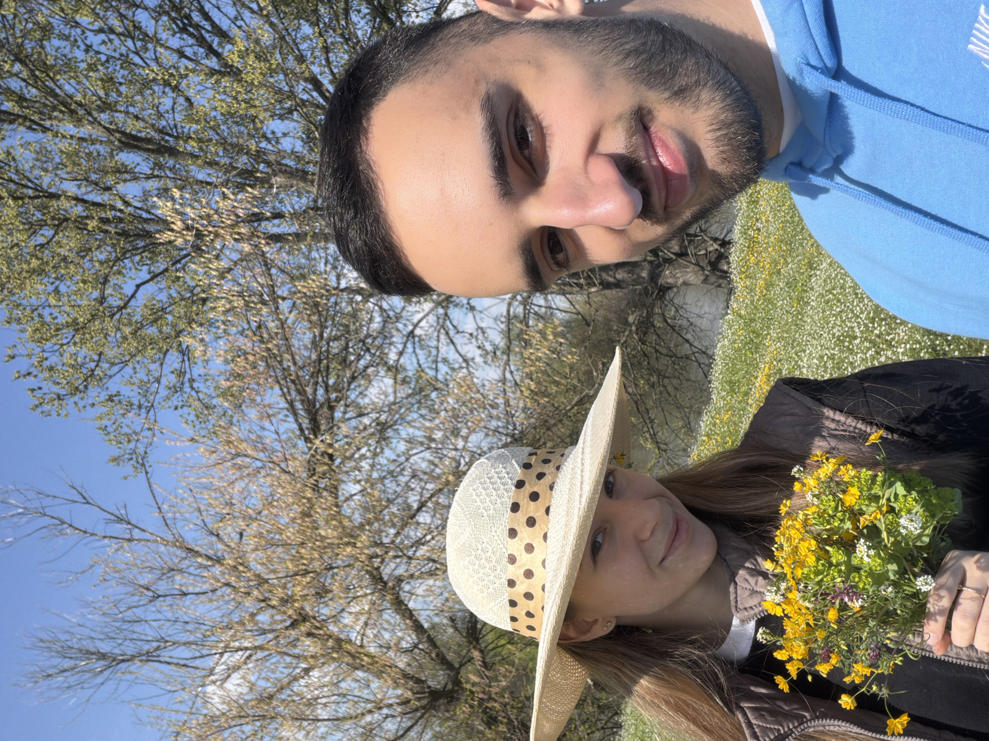 A selfie-style photograph shows a man and a woman in an outdoor setting. The man, with dark hair and a beard, is wearing a blue hooded sweatshirt. The woman is wearing a wide-brimmed straw hat with polka dots and holding a bouquet of yellow and white wildflowers. The background consists of trees with budding leaves, a field of small white and yellow flowers, and a blue sky. The location is Milevo, Bulgaria.