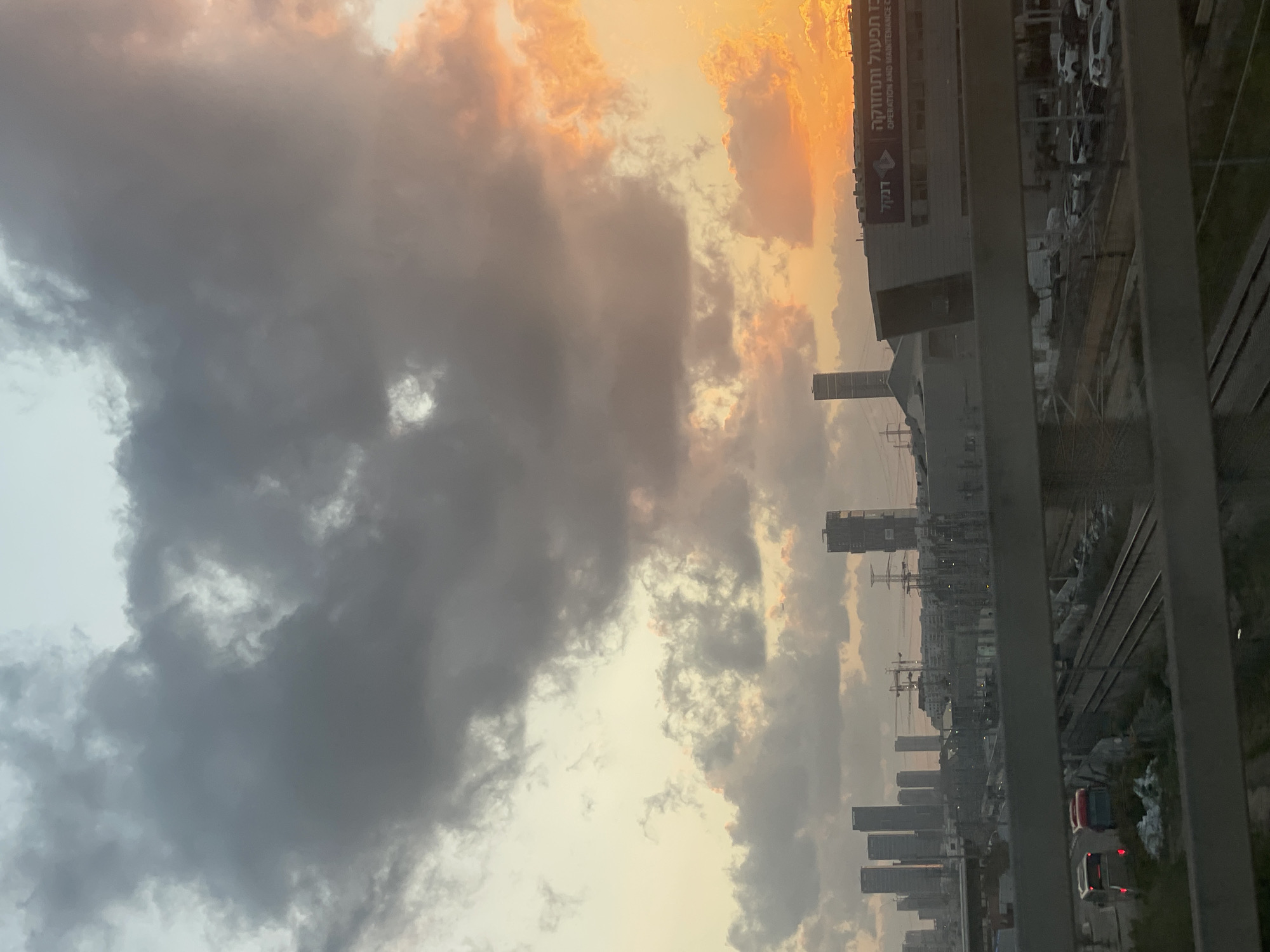 view from a building, likely an apartment, overlooking the city of Petah Tikva, Israel. The scene is dominated by a dramatic sky with dark gray storm clouds covering the left side, contrasted with an orange and yellow sunset on the right. Below the sky, a cityscape is visible, including numerous high-rise buildings and construction cranes. A railway line runs parallel to the buildings. In the foreground, the frame of a balcony or window is present. A building with Hebrew writing is also visible.
