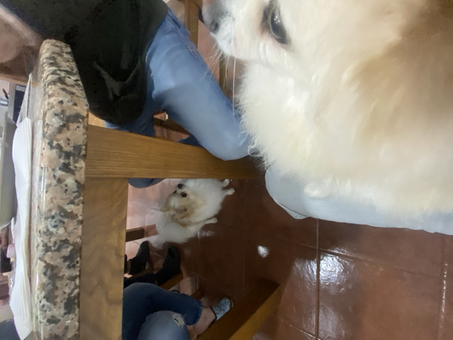 The scene depicts an indoor gathering in Barcelos, Portugal, centered around a granite-topped table with substantial wooden legs. The floor is covered with glossy reddish-brown tiles featuring dark grout lines, reflecting ambient light. Multiple individuals are partially visible, seated around the table. On the left, a person's legs are seen wearing ripped blue jeans and light blue-and-white patterned flat shoes. Behind them, another person's lower legs and black shoes are visible. On the right, a person's legs in blue jeans and a dark top are seated. The individual capturing the image has a light blue-grey fabric resting on their lap, which is partially visible in the foreground. Two dogs are present. A small, fluffy dog with cream and tan markings stands on the tiled floor beneath the table, looking upwards and slightly to the right, attentive to the activity above. In the immediate foreground, a large, fluffy white dog, possibly situated on the photographer's lap or very close to the camera, dominates the lower right portion of the image, with its left eye and extensive white fur clearly visible. A light-colored plate is partially visible on the table surface, along with other indistinct dining items.