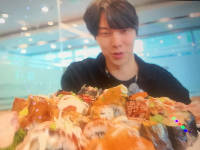 The image depicts a young East Asian male in an indoor setting, presenting a very large platter of assorted sushi and sashimi rolls