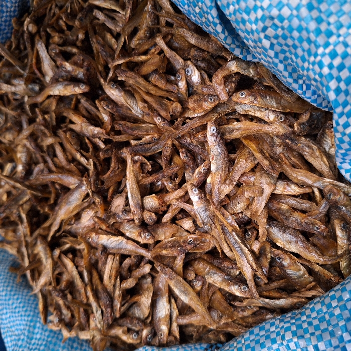 A pile of dried fish, likely small species, is contained within a blue and white checkered sack or bag