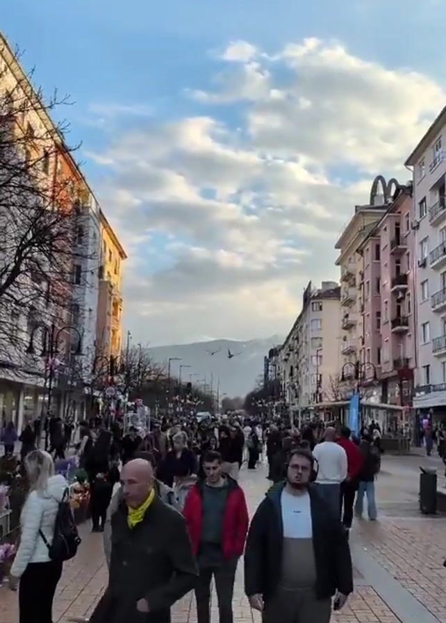 A pedestrian street in a city is seen in a vertical video with a slight tilt, packed with people walking along it. The street is paved with rectangular, reddish-brown bricks arranged in a running bond pattern. Buildings line both sides of the street, varying in height and architectural style. Some buildings are painted in light hues such as peach or cream. The sky is blue with scattered white clouds. Distant mountains are visible at the end of the street. Trees are present, some with bare branches. People of all ages and ethnicities are walking in both directions. Some are pushing strollers or carrying bouquets of flowers. The scene appears to be recorded during the day, with the lighting suggesting either early morning or late afternoon. The overall impression is of a bustling and lively urban environment.