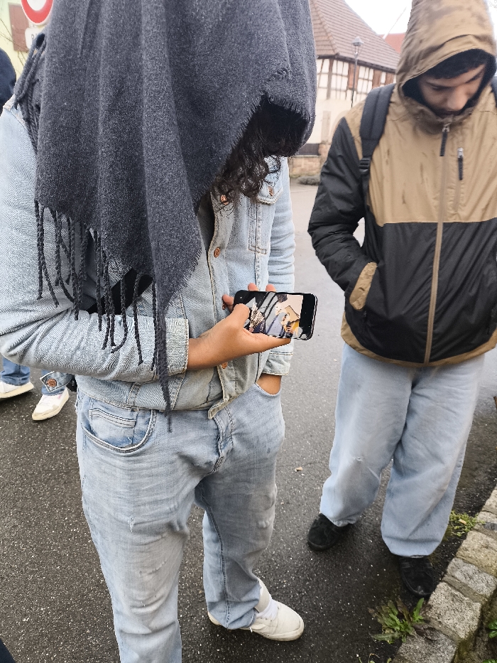 The image depicts three individuals outdoors on a paved surface in Meistratzheim, France, under overcast lighting conditions. In the foreground, an individual with dark, curly hair, partially obscured by a dark grey fringed scarf draped over their head and shoulders, wears a light blue denim jacket, light blue denim jeans, and white athletic shoes. This individual's right hand holds a black smartphone horizontally, displaying an indistinct image or video, while their left hand is in the front pocket of their jeans. To the right, a second individual, a male, wears a two-tone tan and black hooded jacket with the hood up, light blue loose-fitting jeans, and dark-colored shoes. He carries a black backpack and has both hands in his jacket pockets, with his head tilted downwards. A third individual's lower leg and white shoe are partially visible on the far left. The ground consists of a dark, wet paved surface, with a narrow strip of cobblestone and sparse green vegetation along the right edge. In the background, a traditional half-timbered house with a red tiled roof is visible, characteristic of the Alsace region.