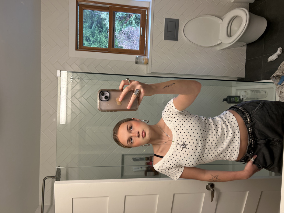 A person in a white polka dot shirt and jeans takes a selfie in a bathroom mirror. The bathroom has a toilet, a glass shower door, and white herringbone tile. A window is visible above the toilet. The person is wearing rings, earrings, and a necklace with a star pendant. A black bra strap is visible. The phone case is a tan color with a design on it. The person has a star tattoo on their arm.