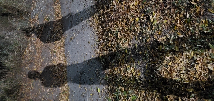 The image depicts an outdoor ground-level scene in Cabudare, Venezuela, observed under low light, likely from an artificial source or twilight conditions. Two distinct, elongated human-shaped shadows are cast from a light source positioned behind the subjects. These shadows fall across a textured dark grey paved surface, which shows minor cracks, and an adjacent natural ground area. The natural area is densely covered with dry, fallen leaves in shades of brown and yellow, interspersed with patches of green vegetation and dry grass. The shadow on the left presents a clear profile of an upright individual; the shadow on the right, positioned adjacently, similarly depicts an upright figure. In the background, undefined masses of dark vegetation, consistent with shrubs or tall grasses, are dimly visible.