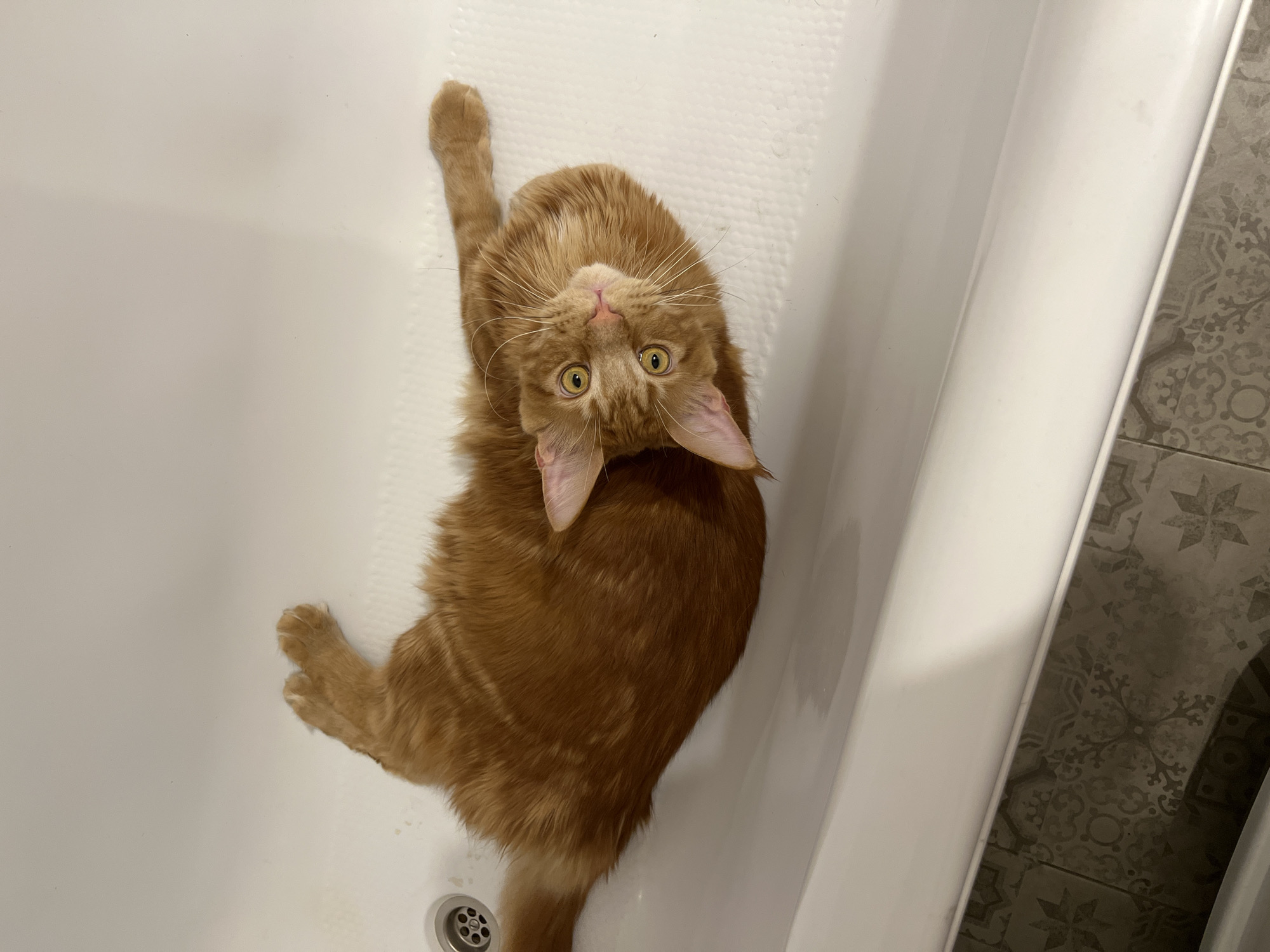 An orange cat lies upside down in a white bathtub. The cat is facing the camera with its head tilted back. Its eyes are wide and yellow. Its right paw is extended upwards. The bathtub has a drain in the lower left. The wall to the right shows gray patterned tiles. The location is not identified as Saint Petersburg, Russia, within the image.