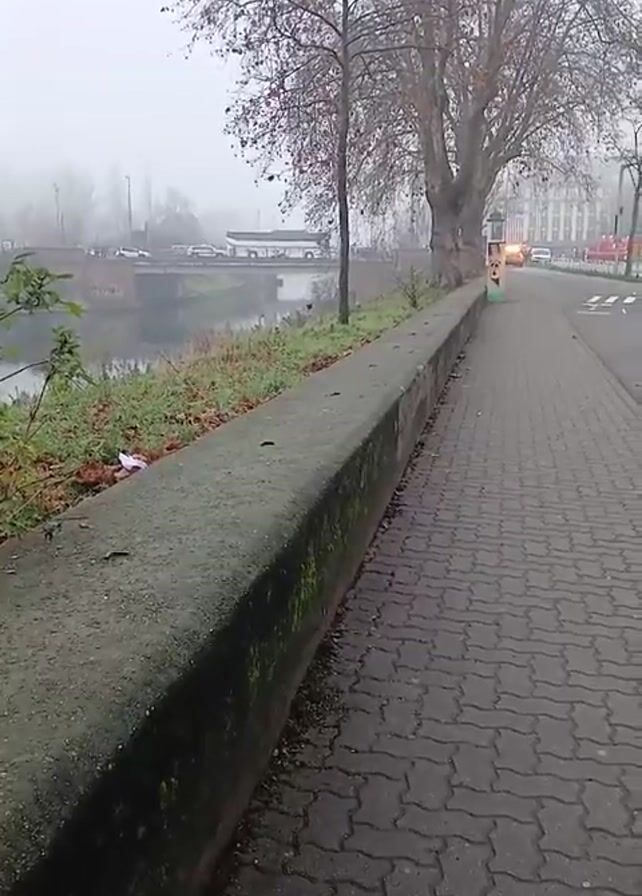 The video depicts a foggy day scene alongside a canal in an urban environment