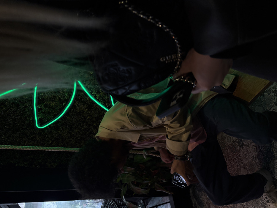 A person with dark curly hair looks down at a phone, wearing a light tan jacket over a pink garment and dark pants. The person also wears silver bracelets and holds a black purse with a chain strap. Green neon lighting accents the dark background. A thick rope runs horizontally across the middle ground. The person appears to be indoors on a decorated floor.