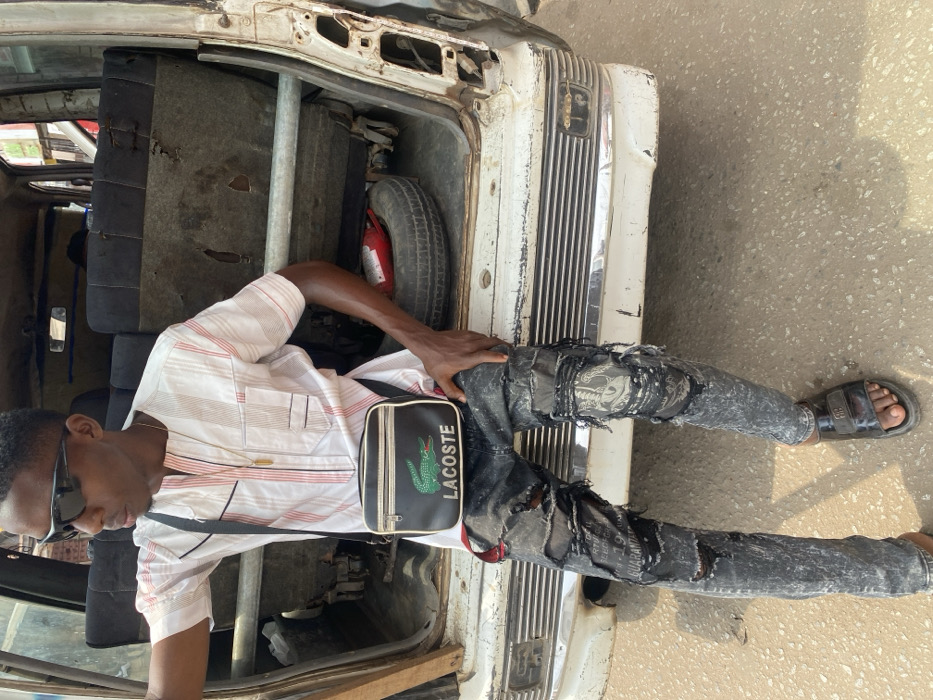 A male individual is observed seated on the rear bumper of a severely damaged, white utility vehicle, consistent with a passenger van or bus, outdoors on a paved surface. He wears dark sunglasses, a short-sleeved white and red striped shirt, heavily distressed dark jeans, and black slide sandals. A black shoulder bag, branded "LACOSTE" with a green crocodile logo, is worn across his chest. A metallic gold pendant hangs from his neck. His right hand rests on his right thigh, while he looks towards the right of the frame. The vehicle's rear tailgate is either absent or open, revealing a dilapidated interior with worn, dark seating upholstery and a bare metal crossbar. A spare tire and a red vehicle jack are visible on the vehicle floor. The vehicle's exterior shows extensive paint chipping, rust, and general disrepair. The ground surface is light gray asphalt. While the image is consistent with an urban environment in Owerri, Nigeria, specific identifying landmarks within the city are not discernible.