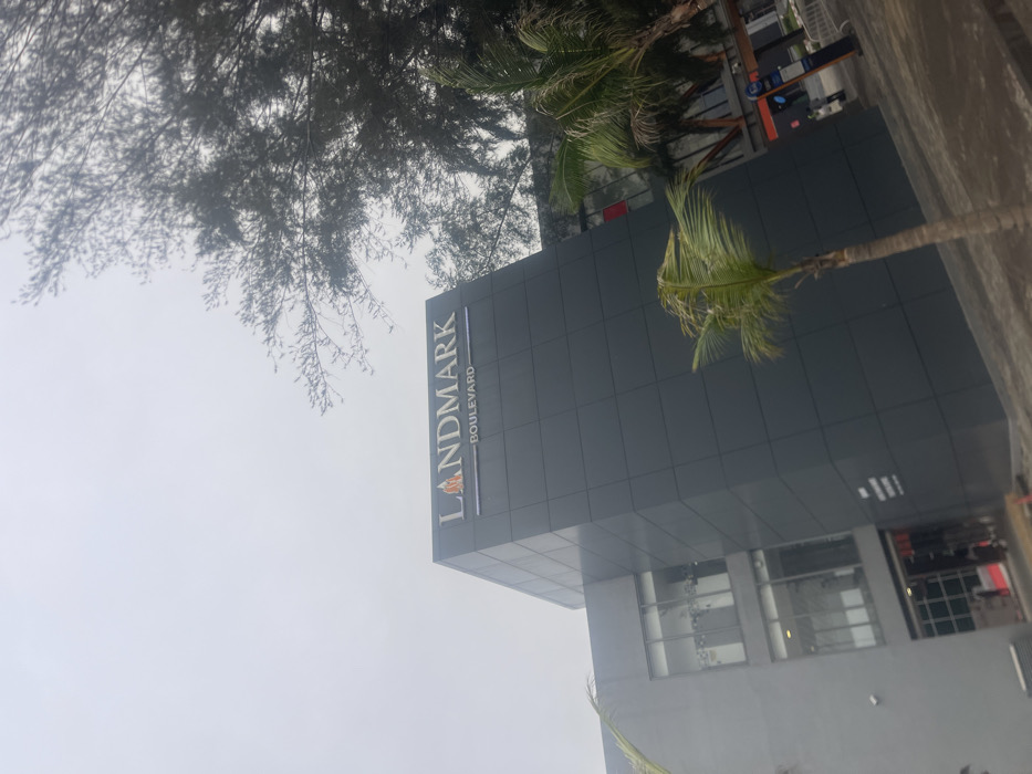 The building with "Landmark Boulevard" signage rises against a cloudy sky, partially obscured by trees