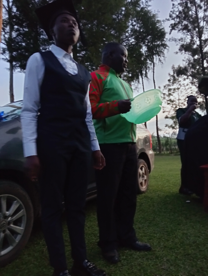 Two men stand on the lawn in front of a car on a cloudy day. The man on the left wears a white shirt, a vest, and a graduation cap. He stares upward. The man on the right wears a green jacket with red sleeves and black pants. He holds a light green bowl. Other people are visible in the background, some standing near a red object. Trees are in the background.