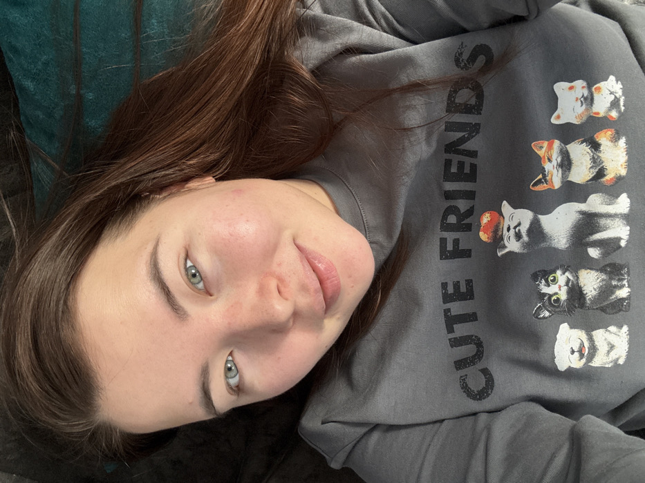 A close-up, overhead selfie-style photograph depicts an adult female lying down in an indoor setting. The specific location within the city of Зура, Russia, cannot be determined from the visual information provided. The subject is a light-skinned female with long, dark brown hair spread out around her head and blue-green eyes. She looks directly at the camera with a slight smile. Her face shows a natural complexion with minor redness on the cheeks and nose. She is wearing a dark grey long-sleeved top or sweatshirt. The garment features black, distressed text across the chest reading "CUTE FRIENDS." Below the text is a graphic of five stylized animal figures. From left to right, these include: a small, light-colored, smiling dog-like figure; a black and white cat with prominent green eyes; a grey cat looking upwards with a small red object, possibly an apple or heart, balanced on its head; a multi-colored cat (orange, brown, white, black) looking forward; and a small white cat with orange markings. The background is indistinct and dark, appearing to be a soft fabric surface, possibly a bed or sofa, with a patch of dark teal/green fabric visible on the upper right side. There are no other individuals or objects prominently visible, and no discernible interactions beyond the subject engaging with the camera for the photograph.