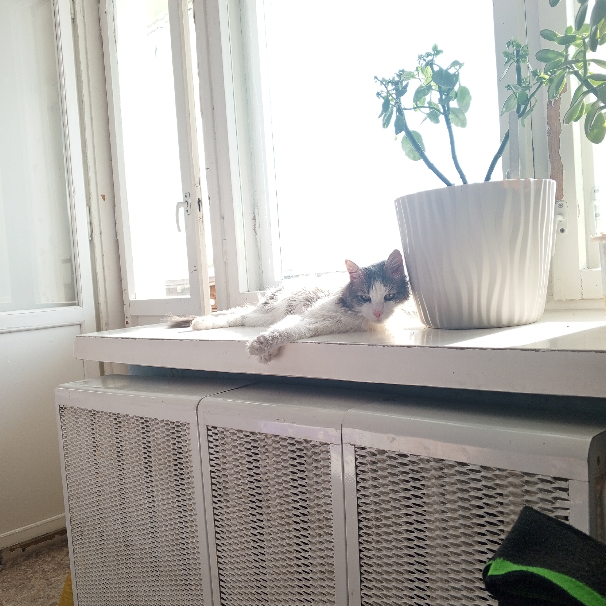The image displays an interior scene within a residence in Chaikovsky, Russia, illuminated by strong natural light from a window. A lean, domestic short-haired cat, predominantly white with grey and brown tabby markings on its head and tail, lies stretched on its belly on a white windowsill. Its front paws extend forward, with one paw partially hanging over the windowsill's edge. The cat's eyes are open, directed towards the viewer. To the right of the cat, a green leafy plant with multiple stalks is contained within a white ceramic pot featuring a vertical corrugated texture, also positioned on the windowsill. The window consists of multiple panes framed by white wooden sashes, which show signs of wear and chipped paint. A white window handle is visible on the right-hand frame. Below the windowsill, two white metal covers with a diamond-patterned mesh design conceal heating elements. A dark green cloth or towel with a bright green stripe is partially visible in the bottom right corner, resting on the radiator cover. The floor in the bottom-left quadrant is a light-colored, possibly tiled or linoleum, surface. A light-colored wall is visible on the far left.