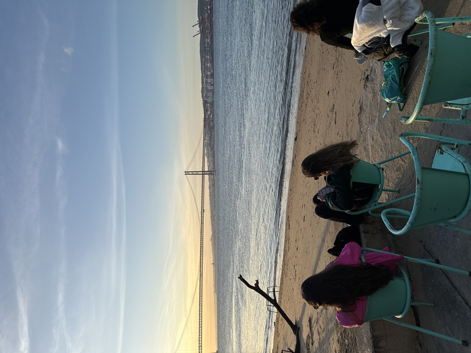 The image captures a riverside scene in Almada, Portugal, at sunset, looking north across the Tagus River towards Lisbon and the 25 de Abril Bridge. In the foreground, three individuals are seated in weathered light green metal chairs on a concrete ledge that transitions into a sandy beach. All three are positioned with their backs to the viewer, facing the river and the distant city. The leftmost person wears a bright pink long-sleeved top and dark bottoms; a black bag is on the ground behind their chair. The central person, with long light brown hair, wears a dark green long-sleeved top and dark bottoms, and is actively looking at a smartphone held in their hands. The rightmost person, partially visible, wears a dark top; a white garment is draped over their chair, and a teal bag rests on the ground beside them. An additional empty light green metal chair occupies the bottom right corner of the frame. The mid-ground features the Tagus River, with gentle ripples on its surface, and a stretch of sandy beach where a large piece of driftwood or a tree branch lies partially submerged near the water's edge on the left. The background is dominated by the 25 de Abril Bridge, a prominent suspension bridge with red-orange towers and a visible truss structure, illuminated by the setting sun. Beyond the bridge, the skyline of Lisbon is visible, displaying various buildings, distant hills, and multiple large red and white industrial cranes along the waterfront. The sky presents a gradient from golden-orange at the horizon to a clear light blue overhead, with minimal wispy cloud formations. The low sun, positioned to the left, casts long shadows towards the viewer.