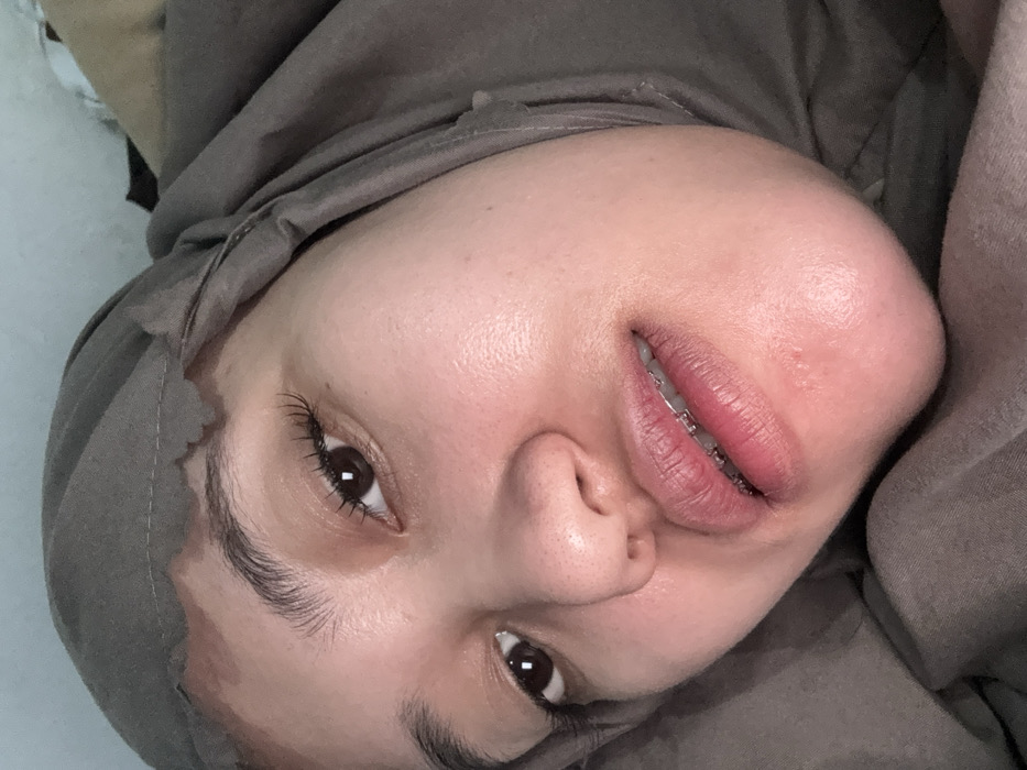 A close-up, angled portrait features an individual, a young woman, partially reclining and looking directly at the camera. She is wearing a light brown or greyish-brown hijab that frames her face. Her skin appears clear, with prominent dark irises and well-defined eyelashes. Her mouth is slightly open, revealing dental braces on her upper teeth. A portion of matching soft, indistinct fabric, likely a garment or bedding, is visible in the background and foreground, indicating an indoor setting. This scene is observed in Gadingrejo, Indonesia.