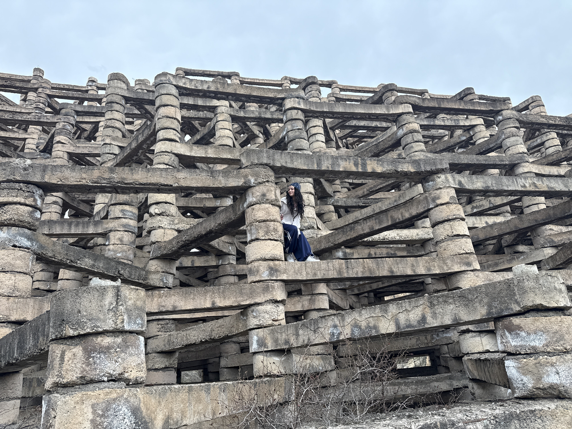 An overhead, wide-angle shot depicts a young woman seated within a massive, dilapidated concrete structure in Areni, Armenia, under an overcast sky. The structure itself is a complex, multi-tiered grid of weathered concrete beams and stacked, cylindrical-like pillars, exhibiting dark discoloration and lighter patches consistent with exposure. The woman, with long dark hair and wearing a light-colored hooded top, dark blue track pants with a white stripe, and light-colored sneakers, is positioned centrally within the frame, seated on one of the horizontal concrete beams at a mid-level of the structure. A blue patterned scarf is visible on her head. Her legs are extended downward, resting on a lower beam. Sparse, dry, thorny vegetation is visible at the very bottom edge of the frame, at the base of the concrete edifice. The sky above the structure is a uniform light grey.