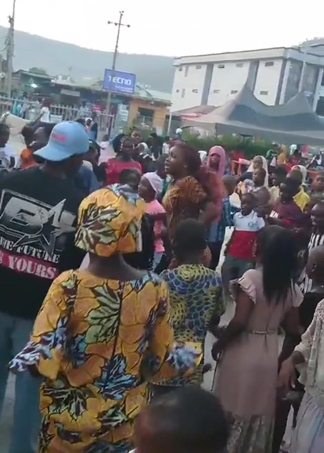 A crowd of people, mostly children and some adults, is gathered outdoors in what appears to be a public square or gathering place. The crowd seems to be enjoying an event with music playing in the background. Some people are dancing or moving to the rhythm. The setting includes buildings and what looks like a "Tecno" sign in the background, suggesting an urban or semi-urban area. The weather appears pleasant, with a mix of cloudy and bright conditions.