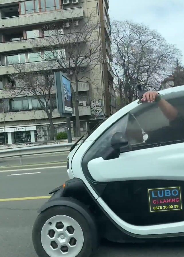 white Renault Twizy car being driven on a city street. The car has a sticker for "LUBO CLEANING" on its side. A person's arm is sticking out of the window. The background includes buildings, billboards, and other cars. The video is shaky, suggesting it was recorded from a moving vehicle.