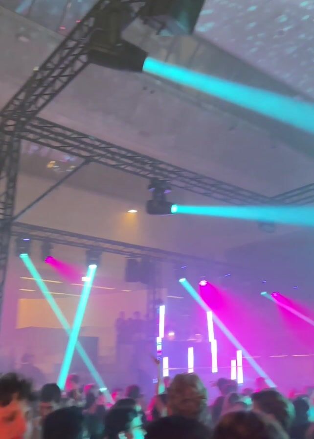 The video captures a lively party scene indoors, with a dense crowd of people gathered under a complex lighting system