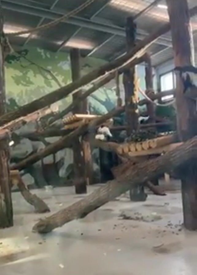 n indoor enclosure for colobus monkeys. The enclosure is designed to mimic a forest environment, with several wooden beams and branches arranged for the monkeys to climb and play on. In the background, a mural depicts a forest scene. There are multiple colobus monkeys present, moving around and perched on the wooden structures. The floor of the enclosure appears to be concrete. Light fixtures hang from the ceiling, illuminating the space. In the foreground, a metal tray with some food is visible. Occasionally, the camera shows an obscured view of the person taking the video, due to reflections off the glass enclosure.