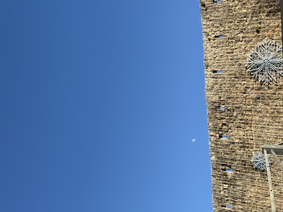 The image displays a daytime outdoor scene in Budva, Montenegro. The upper two-thirds of the frame are dominated by a clear, bright blue sky. A distinct crescent moon is visible in the upper-left portion of the sky. The lower third of the image features a textured wall, appearing to be constructed from stacked or contained rough-hewn stones, possibly a gabion wall. This wall features several small, vertically oriented rectangular openings at various intervals along its length. Affixed to the lower section of the wall are two large, reflective, snowflake-shaped decorations, suggesting a winter or festive period. One snowflake is positioned in the lower-left quadrant, partially obscured by a light-colored metallic railing or structural element in the immediate foreground. The second snowflake is located towards the lower-right. No people or specific actions are discernible. The environment is clear and illuminated, indicative of sunny weather. The precise location within Budva cannot be determined from the visual information provided.