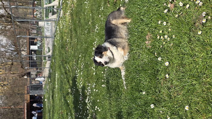 - "A medium-sized, tri-colored dog (black, white, and tan/grey markings) wearing a dark collar is observed lying on a patch of bright green grass, heavily interspersed with white daisy-like flowers" by FM-OXDrT2, licensed under CC BY 4.0