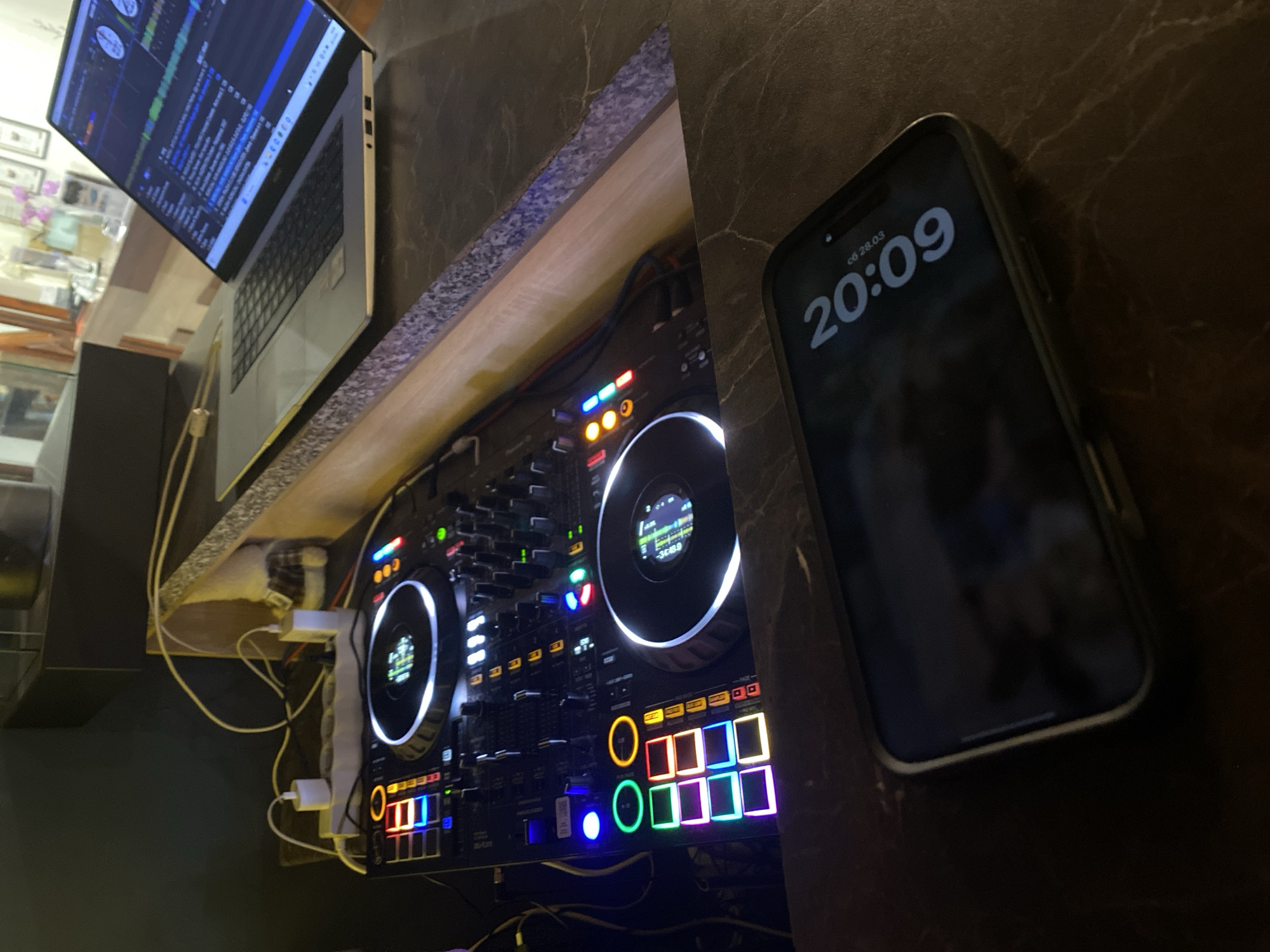 DJ setup indoors. A laptop with DJ software displayed on its screen is positioned on a shelf above a Pioneer DJ controller, specifically the DDJ-FLX10 model. Various power adapters and cables are connected to the setup. An iPhone displaying the time "20:09" and date "сб 28.03" (Saturday, March 28th) is positioned to the right of the controller. The scene is dimly lit. There is no indication of location in the city of Varvara, Bulgaria.