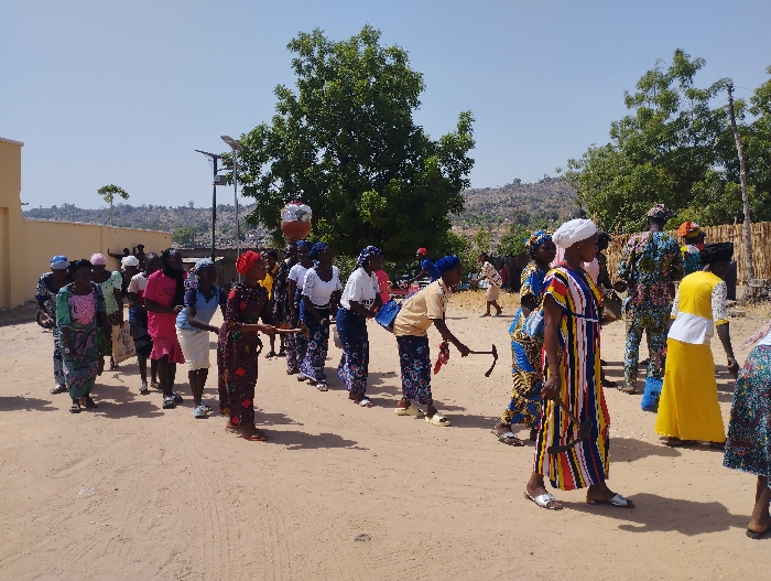 A group of women, predominantly dressed in brightly colored, patterned clothing, are gathered in an open-air area. They are standing in a line, with the majority of them facing towards the right of the image, and some are looking at the camera. One woman is holding a clay pot on her head, and others are holding various objects. There is a solar powered light pole in the background, and a low yellow building to the left. Several trees are visible behind the women, and a dry, dusty ground is visible underfoot. The location is on the outskirts of Chum, Nigeria, with the coordinates 9.706° N, 11.714° E.