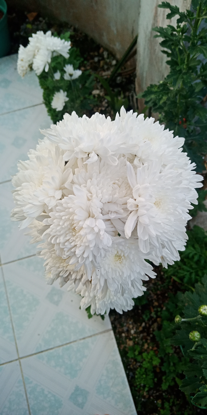 The image displays a high-angle, close-up view of a dense cluster of white chrysanthemum flowers in an outdoor setting, located in Ciherang, Indonesia. The central and dominant subject is a large, spherical formation of fully bloomed white chrysanthemums, exhibiting numerous tightly packed petals. In the lower-left foreground, a light-colored tiled surface, possibly off-white or very light blue-grey, is visible, featuring a subtle geometric pattern and distinct grout lines. The background includes dark green foliage, consistent with chrysanthemum plants, notably on the right side, where several unopened, light green, spherical flower buds are discernible. A dark brown, granular ground cover, consistent with soil or gravel, lies beneath this foliage. In the upper-right background, a vertical, light-colored, rough-textured structure, possibly a wall or a large planter, is present. Additional out-of-focus white chrysanthemum blooms and a partial view of a dark green cylindrical pot are visible in the upper-left background. No human figures or animate subjects are depicted, and no specific actions or interactions are occurring. The scene is illuminated by natural light.