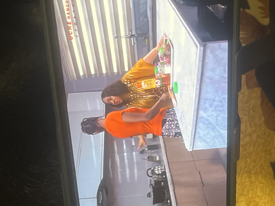 Two women stand at a kitchen counter. One wears an orange shirt and patterned pants. The other woman, facing her, is in a yellow patterned top. Various bottles and jars are on the countertop, along with produce. The kitchen features a steel backsplash and modern cabinetry. The photo appears to be taken of a television screen. Text is visible on the upper left that appears to be a show title.