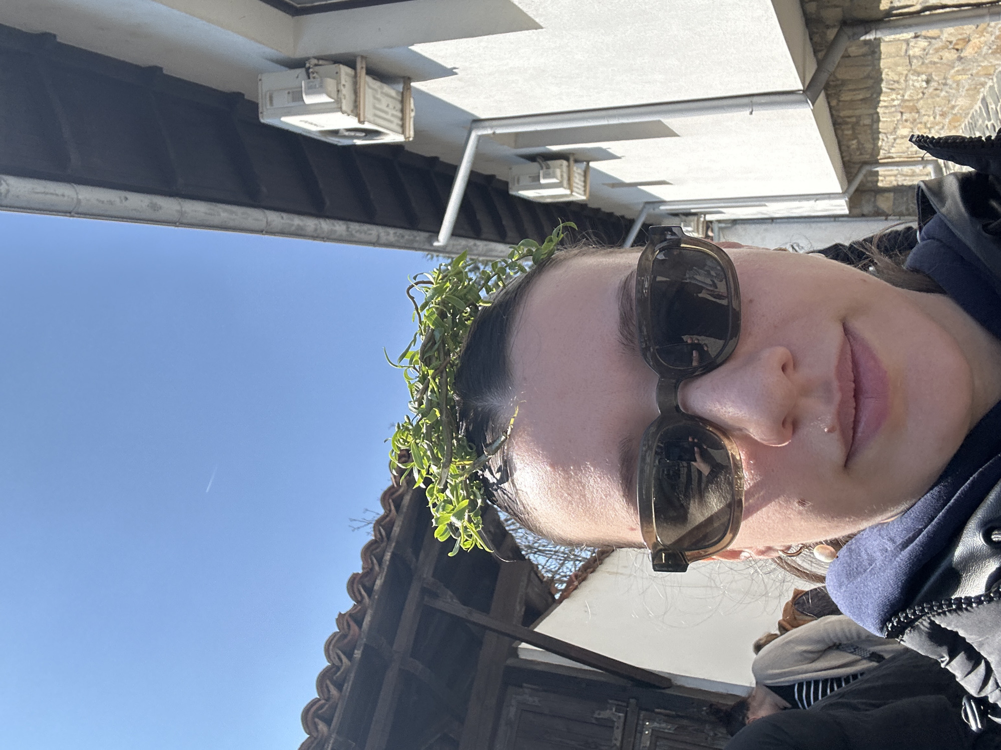 A woman with sunglasses and a leafy crown is shown in an eye-level, tilted selfie against a backdrop of a building in Arbanassi, Bulgaria