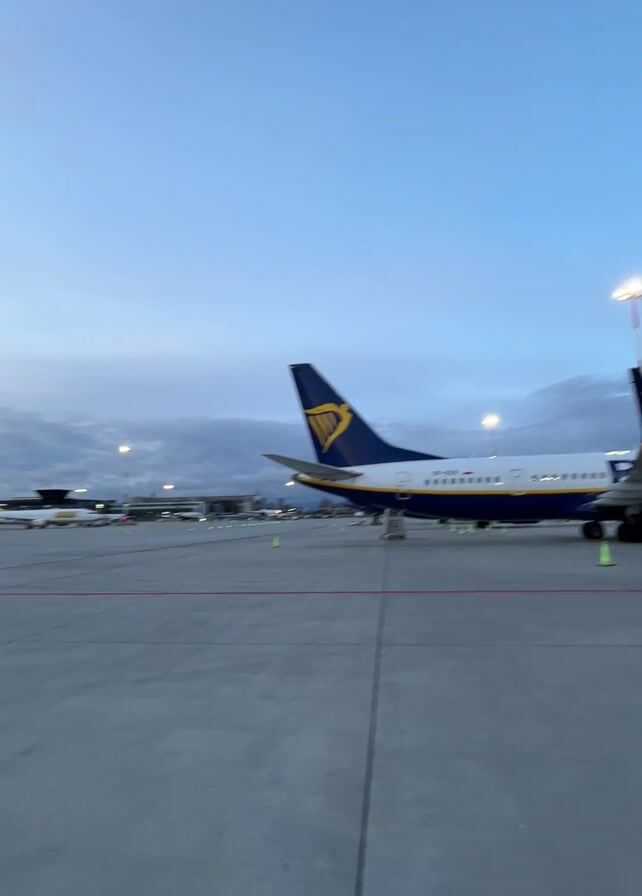tarmac of an airport at dusk, with a Ryanair passenger jet parked in the foreground. The camera pans from the tail of the Ryanair plane to the left, showing other aircraft parked in the distance, and other structures including lampposts and parts of the airport building. As the camera moves, two people walk into view, pulling their luggage behind them. They approach the Ryanair plane.
