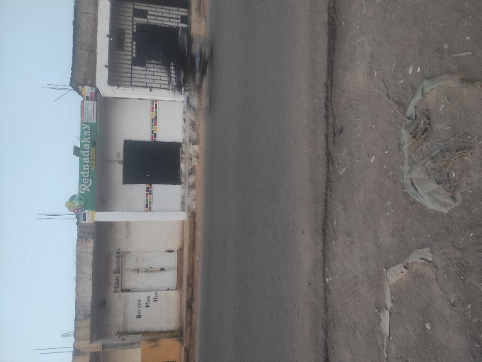 A street view shows a building with two businesses. "Rednadaksy" with what appears to be balloons is on the upper floor. The ground-level business is "Masa Bankspot," with faded painted words saying, "Buy your Masa Here". The road is gray, and some trash is on the shoulder. A structure of some type with a barred area is above the Rednadaksy business. The image is rotated ninety degrees to the right.