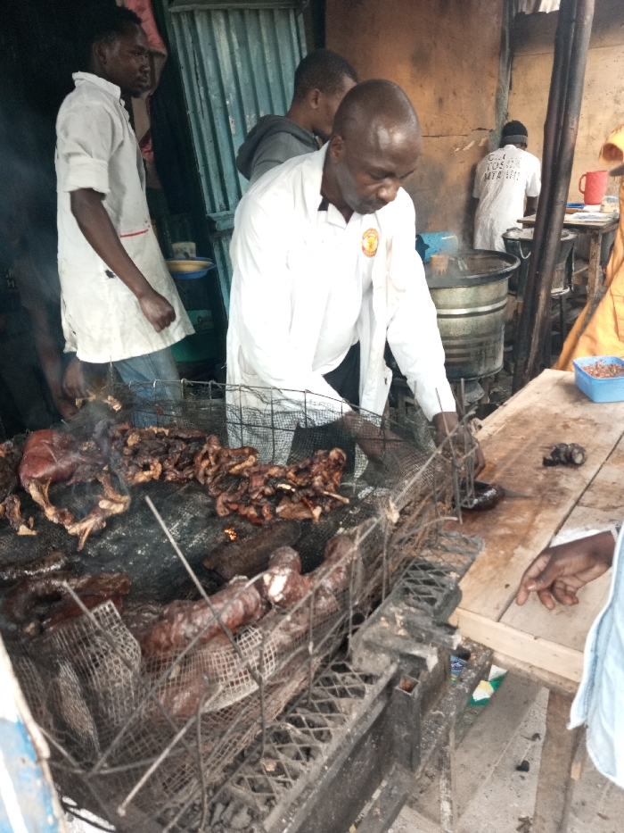 This image captures an active, outdoor or semi-enclosed meat grilling operation in Nairobi, Kenya