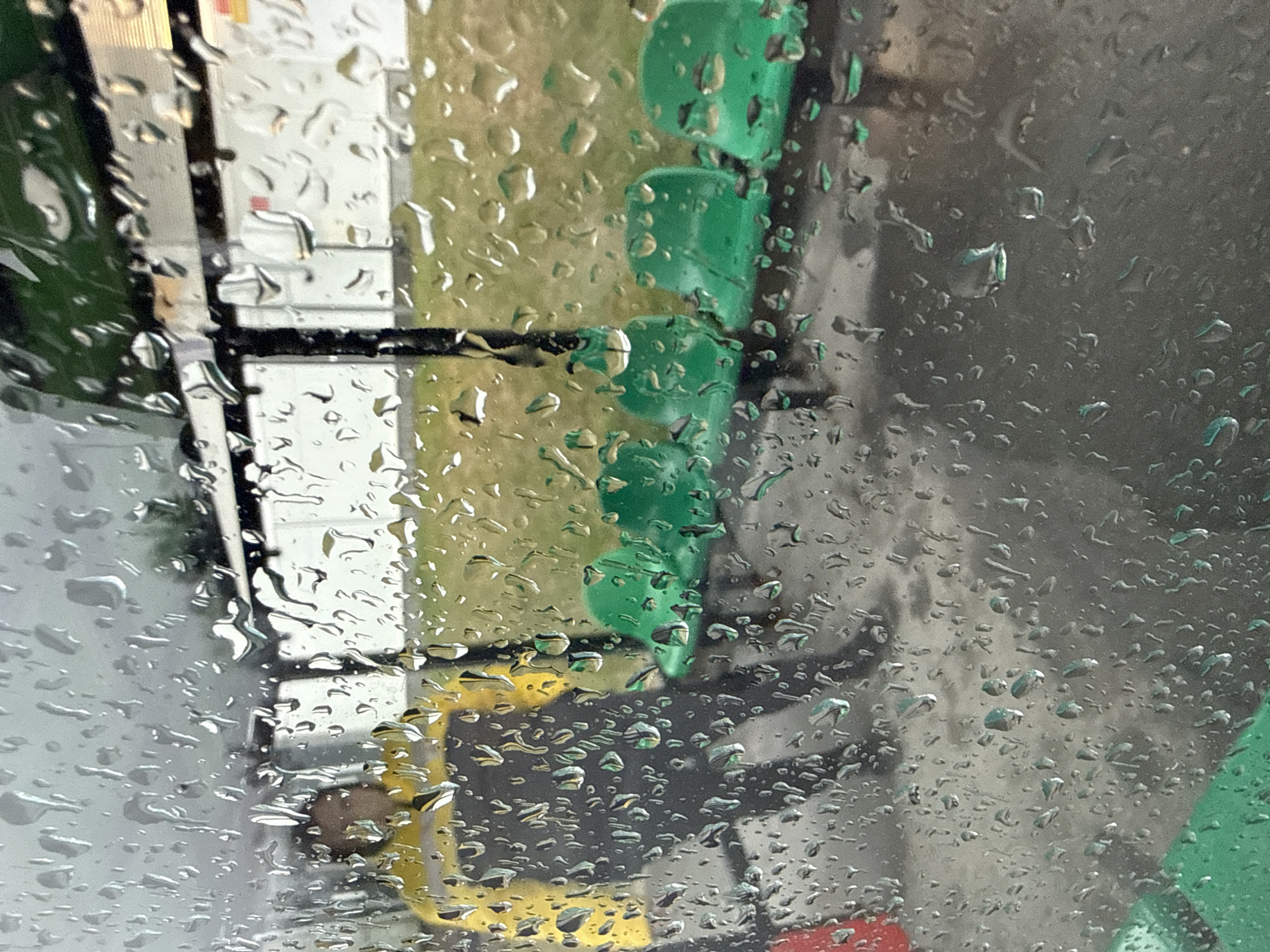 The image is taken through a rain-covered window. The objects visible through the droplets are blurry but appear to be parts of a structure, potentially an outdoor play area or amusement ride, with green, yellow, and red components. The specific details of the objects are obscured by the rain on the window, making identification difficult. The location is unknown.
