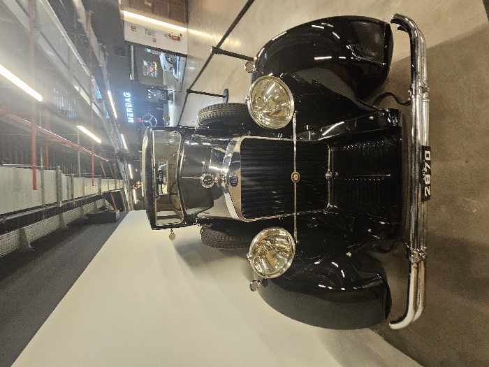 A black, vintage-style automobile is centrally depicted, viewed head-on, in an indoor commercial or museum setting