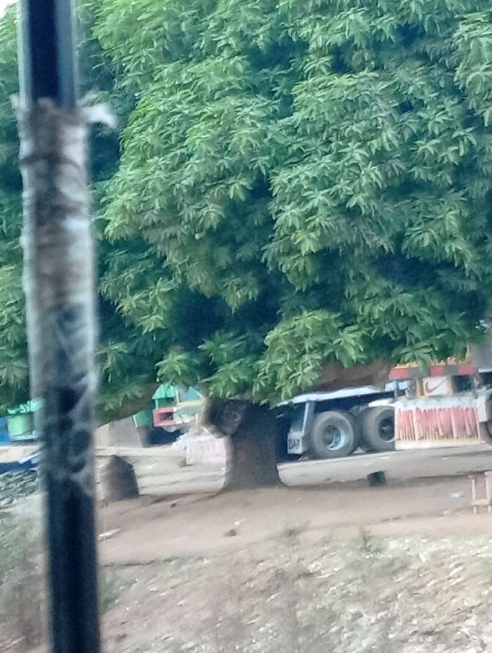 The image depicts an outdoor scene in Nassarawa, Nigeria. A prominent, large tree with dense green foliage occupies the central and upper portions of the frame. Its thick, dark brown trunk is rooted in light brown, exposed soil that forms the ground in the mid-distance. Partially visible behind the tree, to the right, is a heavy-duty vehicle, likely a truck or trailer. Visible components of this vehicle include two sets of silver dual wheels on a white chassis. A "CAT" logo is faintly visible on the white section of the vehicle, and a "Nike" logo is present on a white sign or panel situated above the vehicle's bed area, which is partially obscured by a red and white structure. The foreground on the left is dominated by a blurred, dark vertical object, possibly a pole, partially obscuring the scene. The immediate ground in the foreground consists of dry, sparse vegetation and light brown dirt. Indistinct structures and additional greenery are visible in the background. No individuals are discernible.